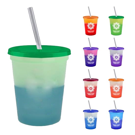 16 Oz color-changing straw tumbler cup that transforms with ice-cold water. Mix and match cup and lid colors.