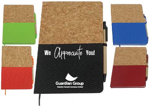 PU hardcover bound journal with a cork-like bottom, color-matching elastic pen loop, elastic closure, and ribbon page marker. Contains 80 lined sheets.
