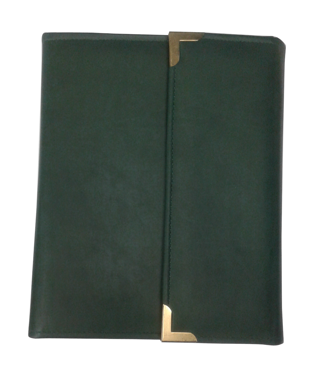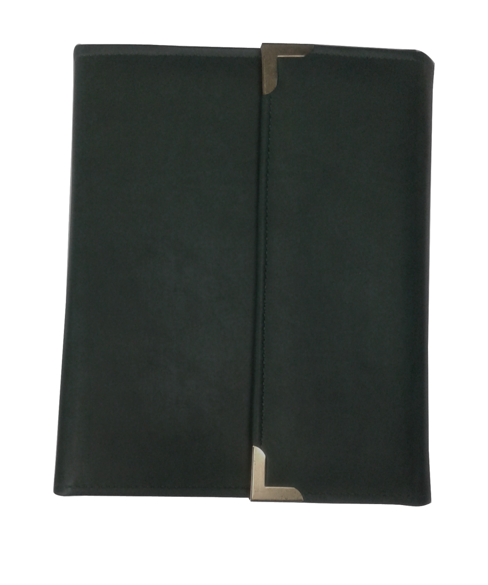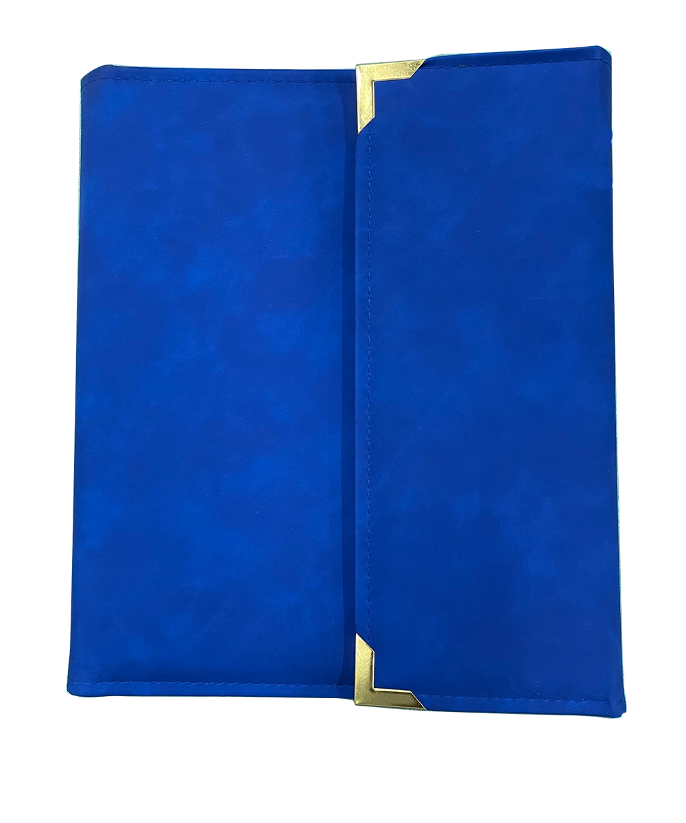 Simulated leather diary with flap and velcro fastener. Comes complete with note pad, pen,pocket pal,business card pockets and calculator.with gold corner finish.