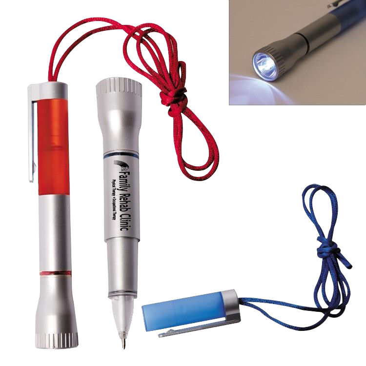 Extra bright white LED light doubles as a flashlight or pen light. Features a side on/off switch and light mode adjustments, with a breakaway neck cord for easy carrying