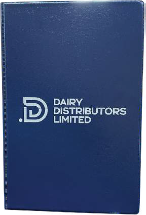 Simulated leather cover with gilt corners, slant utility pocket, and ribbon marker.