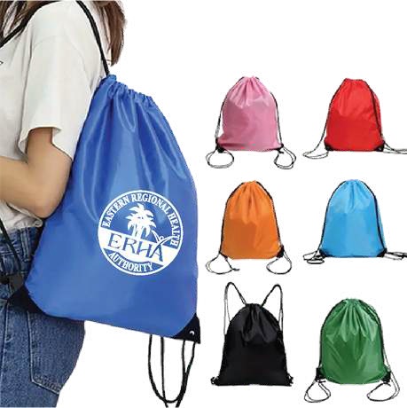 Durable 210D polyester drawstring backpack with simulated leather corner reinforcements and black trim. Features reinforced eyelets and secure drawstring closure. Spot clean and air dry.
